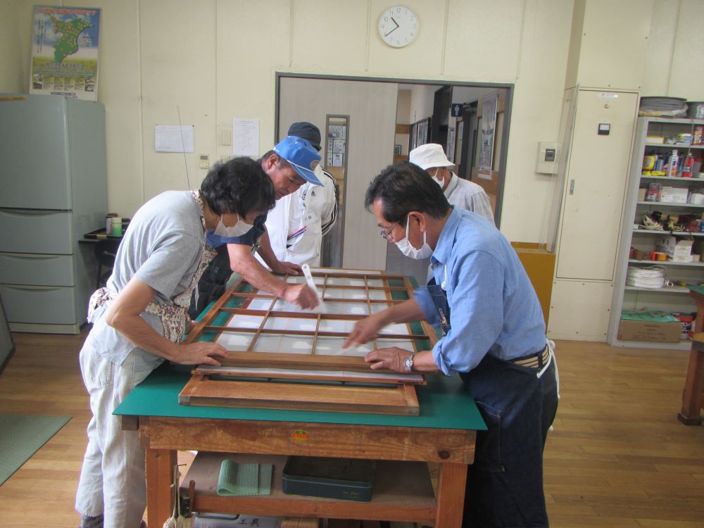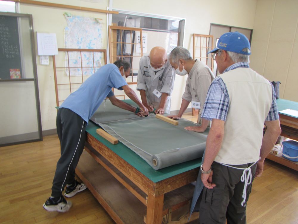 令和5年7月14日 金曜日、 夏真っ盛りのとても暑い中、11名の方にご参加いただき、障子・網戸の張替えに取り組みました。