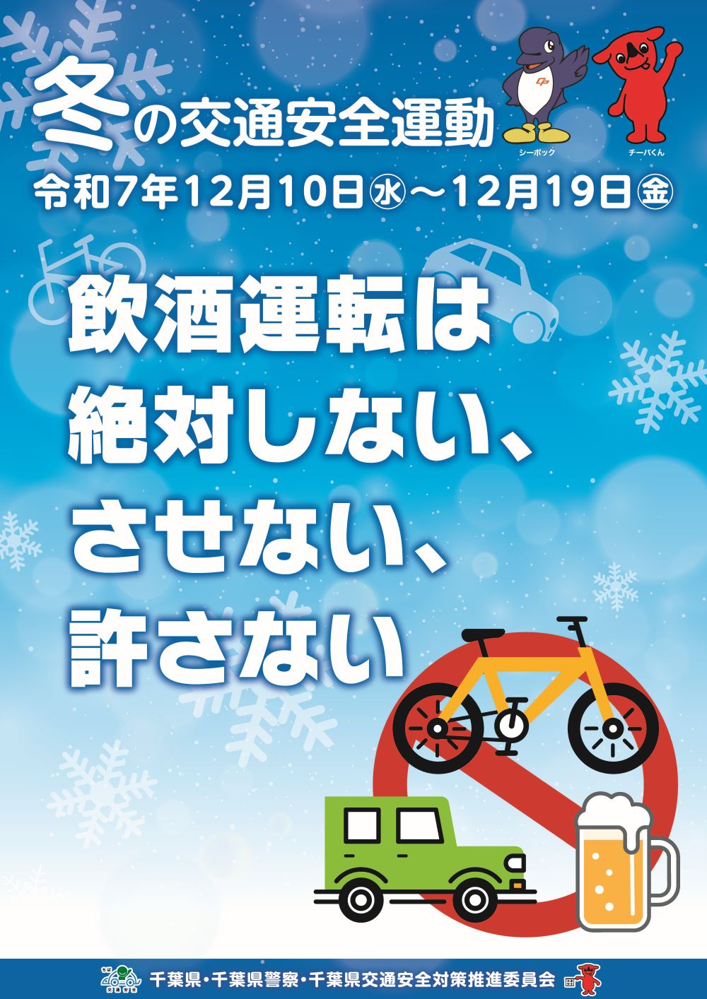 冬の交通安全運動が始まります‼ 新着ニュース 2025.12.10 令和7年12月10日(水曜日)~12月19日(金曜日)までの10日間、冬の交通安全運動実施期間です。 年末は、飲酒の機会が増え、飲酒運転による交通事故の発生が懸念されます。 さらに、この時期は、日没が早く日の出も遅いことから、夕暮れ・夜間・明け方の交通事故の増加も心配されます。 運動期間中に、交通安全教育や広報啓発活動を集中的に展開することにより、県民一人一人が交通ルールを遵守し、正しい交通マナーを実践し、交通事故の防止を図りましょう。 運動の重点・飲酒運転の根絶に向けた取組の推進・夕暮れ・夜間・明け方における交通事故防止・自転車の交通ルールの理解・遵守の徹底とヘルメットの着用促進 スローガン ~ 飲酒運転は絶対しない、させない、許さない ~ 11月25日(火曜日)現在、本年度、千葉県の交通事故による死者数は103人と全国ワースト5位となっています。 市原署管内の死者数は7名で、他の管内より死者数が多くなっていますので、より一層の交通事故防止に努めましょう。
